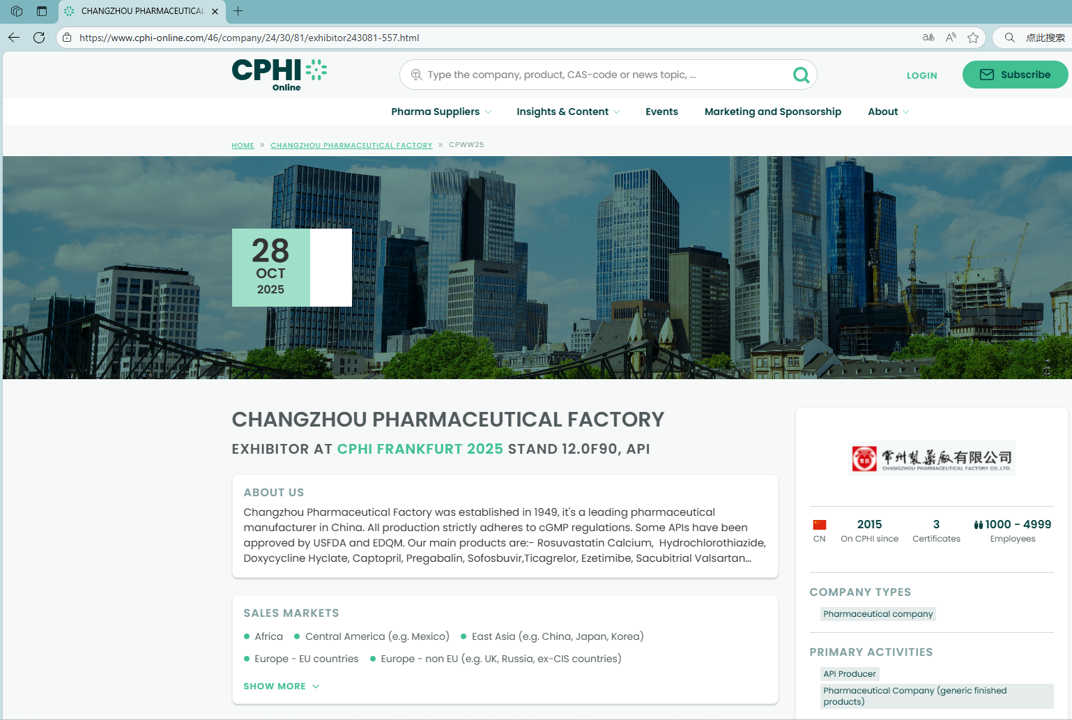 Changzhou Pharmaceutical Factory will make an appearance at this conference. We sincerely invite you to visit booth 12.0F90 for on-site negotiation and communication, and to jointly explore cooperation and development!